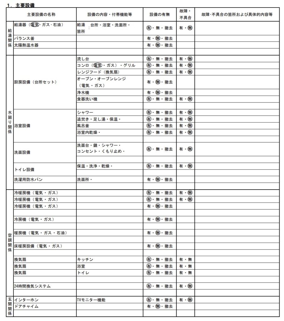 だいたい内容一緒だと思うので、参考までに設備表は下記です。このような内容のものを記載しました。